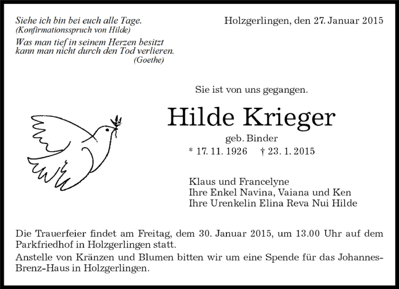 Hier finden Sie alle Traueranzeigen aus der Zeitung, die bisher für Hilde Krieger erschienen sind. Weitere Traueranzeigen, die in der Zeitung erscheinen, werden hier ebenfalls aufgelistet