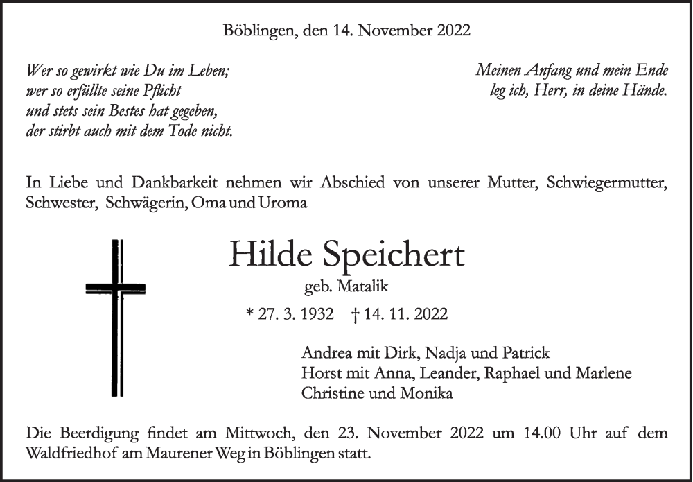 Hier finden Sie alle Traueranzeigen aus der Zeitung, die bisher für Hilde Speichert erschienen sind. Weitere Traueranzeigen, die in der Zeitung erscheinen, werden hier ebenfalls aufgelistet