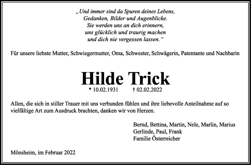 Hier finden Sie alle Traueranzeigen aus der Zeitung, die bisher für Hilde Trick erschienen sind. Weitere Traueranzeigen, die in der Zeitung erscheinen, werden hier ebenfalls aufgelistet
