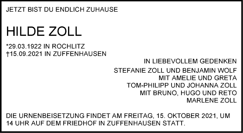 Hier finden Sie alle Traueranzeigen aus der Zeitung, die bisher für Hilde Zoll erschienen sind. Weitere Traueranzeigen, die in der Zeitung erscheinen, werden hier ebenfalls aufgelistet