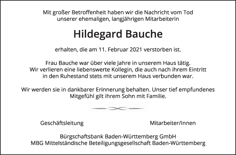 Hier finden Sie alle Traueranzeigen aus der Zeitung, die bisher für Hildegard Bauche erschienen sind. Weitere Traueranzeigen, die in der Zeitung erscheinen, werden hier ebenfalls aufgelistet
