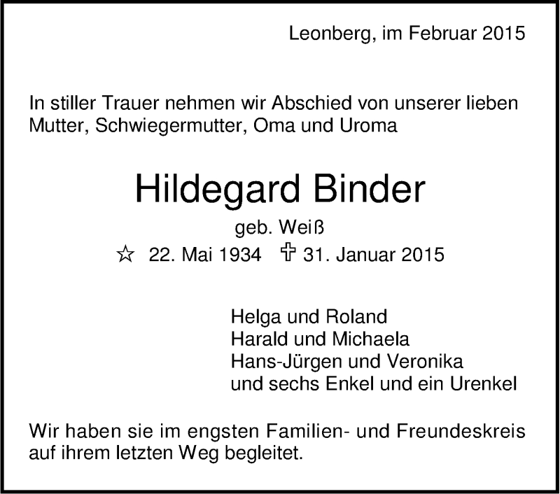 Hier finden Sie alle Traueranzeigen aus der Zeitung, die bisher für Hildegard Binder erschienen sind. Weitere Traueranzeigen, die in der Zeitung erscheinen, werden hier ebenfalls aufgelistet