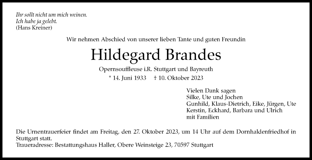 Hier finden Sie alle Traueranzeigen aus der Zeitung, die bisher für Hildegard Brandes erschienen sind. Weitere Traueranzeigen, die in der Zeitung erscheinen, werden hier ebenfalls aufgelistet