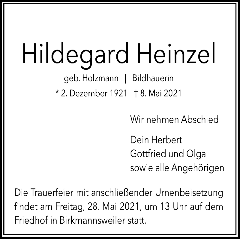Hier finden Sie alle Traueranzeigen aus der Zeitung, die bisher für Hildegard Heinzel erschienen sind. Weitere Traueranzeigen, die in der Zeitung erscheinen, werden hier ebenfalls aufgelistet
