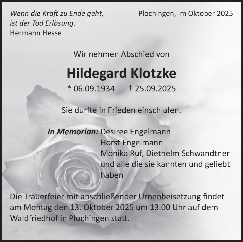 Hier finden Sie alle Traueranzeigen aus der Zeitung, die bisher für Hildegard Klotzke erschienen sind. Weitere Traueranzeigen, die in der Zeitung erscheinen, werden hier ebenfalls aufgelistet