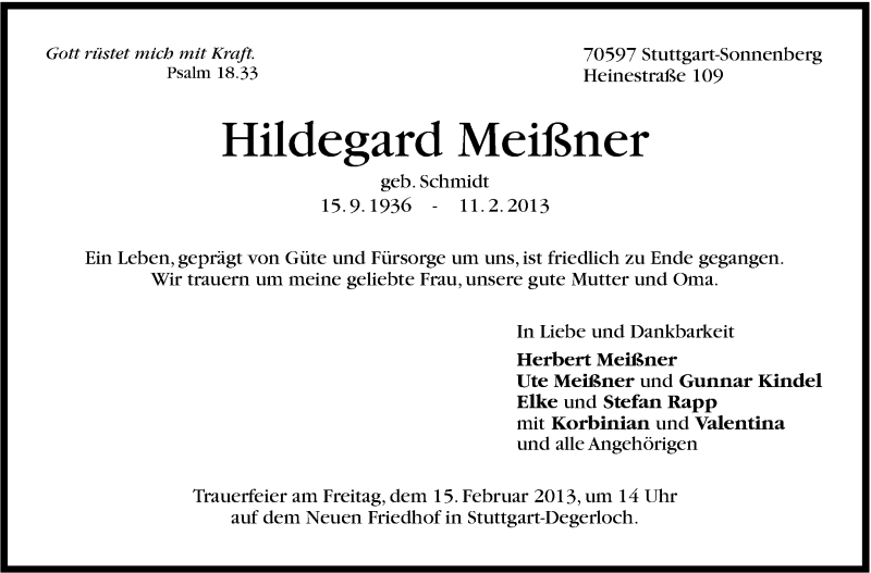Hier finden Sie alle Traueranzeigen aus der Zeitung, die bisher für Hildegard Meißner erschienen sind. Weitere Traueranzeigen, die in der Zeitung erscheinen, werden hier ebenfalls aufgelistet