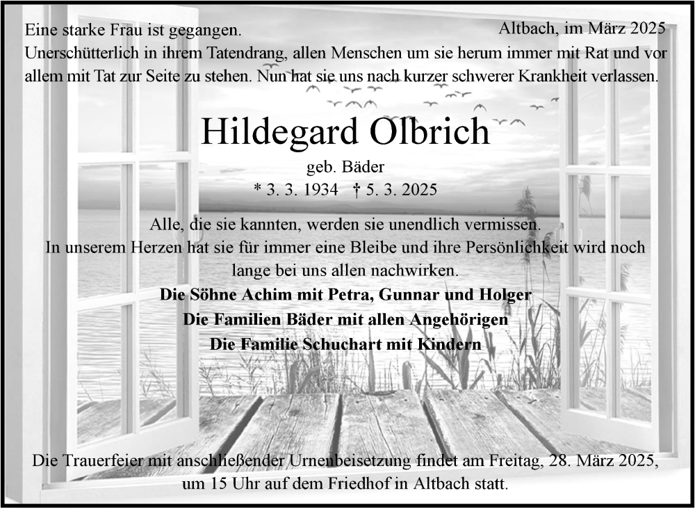 Hier finden Sie alle Traueranzeigen aus der Zeitung, die bisher für Hildegard Olbrich erschienen sind. Weitere Traueranzeigen, die in der Zeitung erscheinen, werden hier ebenfalls aufgelistet