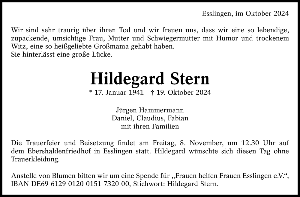Hier finden Sie alle Traueranzeigen aus der Zeitung, die bisher für Hildegard Stern erschienen sind. Weitere Traueranzeigen, die in der Zeitung erscheinen, werden hier ebenfalls aufgelistet