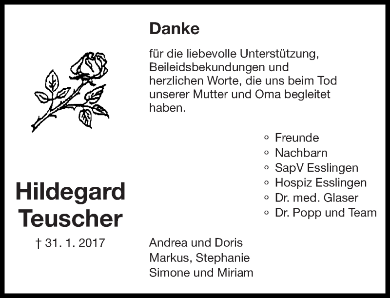 Hier finden Sie alle Traueranzeigen aus der Zeitung, die bisher für Hildegard Teuscher erschienen sind. Weitere Traueranzeigen, die in der Zeitung erscheinen, werden hier ebenfalls aufgelistet