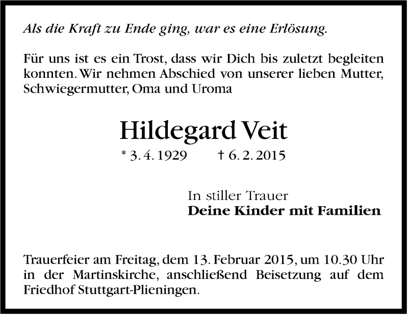 Hier finden Sie alle Traueranzeigen aus der Zeitung, die bisher für Hildegard Veit erschienen sind. Weitere Traueranzeigen, die in der Zeitung erscheinen, werden hier ebenfalls aufgelistet