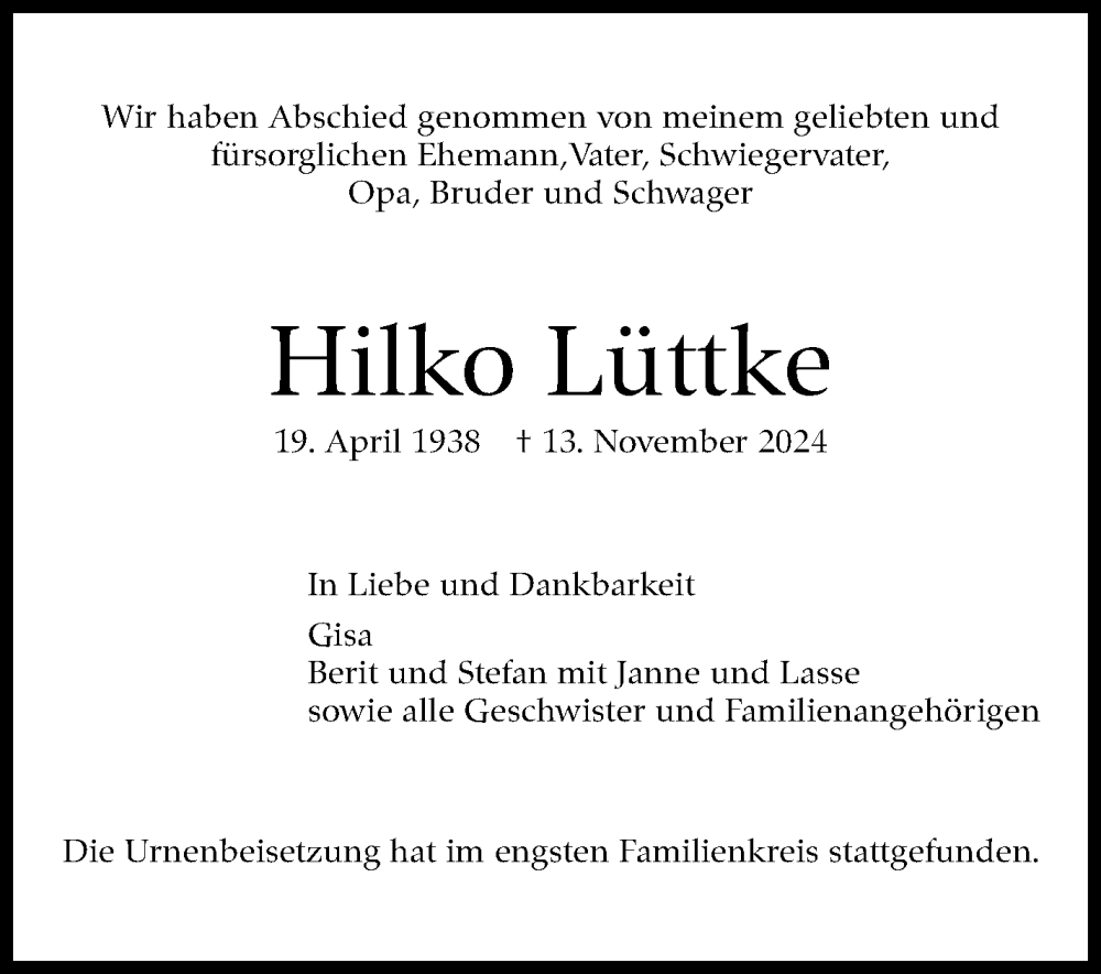 Hier finden Sie alle Traueranzeigen aus der Zeitung, die bisher für Hilko Lüttke erschienen sind. Weitere Traueranzeigen, die in der Zeitung erscheinen, werden hier ebenfalls aufgelistet