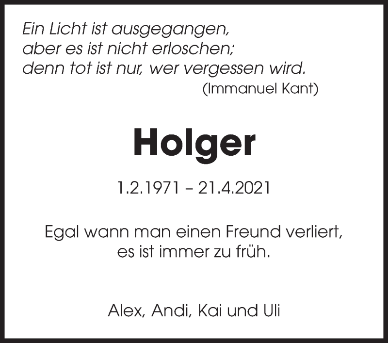 Hier finden Sie alle Traueranzeigen aus der Zeitung, die bisher für Holger erschienen sind. Weitere Traueranzeigen, die in der Zeitung erscheinen, werden hier ebenfalls aufgelistet