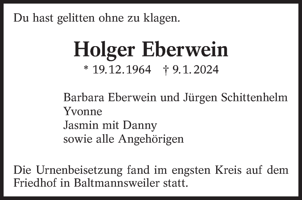 Hier finden Sie alle Traueranzeigen aus der Zeitung, die bisher für Holger Eberwein erschienen sind. Weitere Traueranzeigen, die in der Zeitung erscheinen, werden hier ebenfalls aufgelistet
