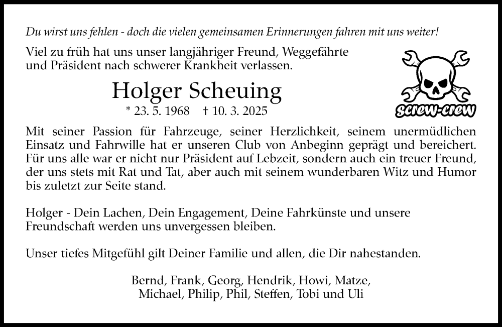 Hier finden Sie alle Traueranzeigen aus der Zeitung, die bisher für Holger Scheuing erschienen sind. Weitere Traueranzeigen, die in der Zeitung erscheinen, werden hier ebenfalls aufgelistet