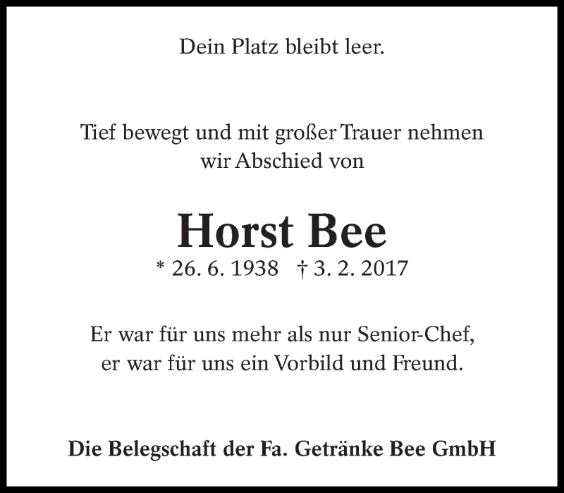 Hier finden Sie alle Traueranzeigen aus der Zeitung, die bisher für Horst Bee erschienen sind. Weitere Traueranzeigen, die in der Zeitung erscheinen, werden hier ebenfalls aufgelistet