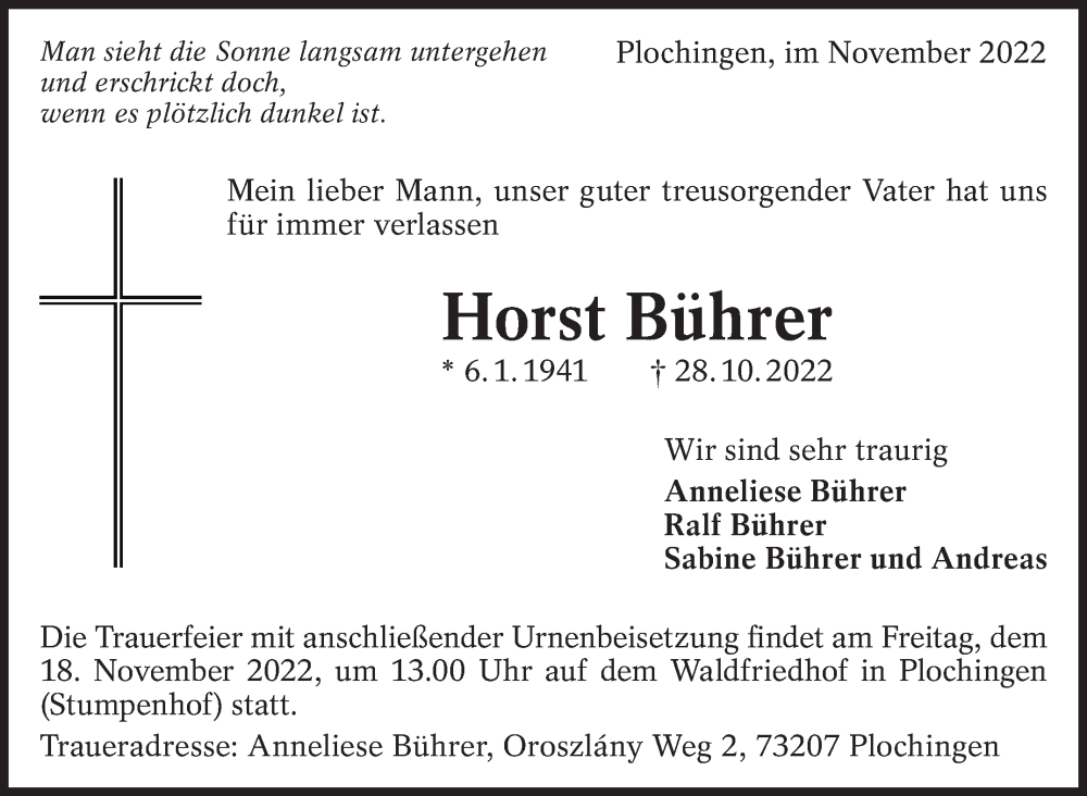 Hier finden Sie alle Traueranzeigen aus der Zeitung, die bisher für Horst Bührer erschienen sind. Weitere Traueranzeigen, die in der Zeitung erscheinen, werden hier ebenfalls aufgelistet