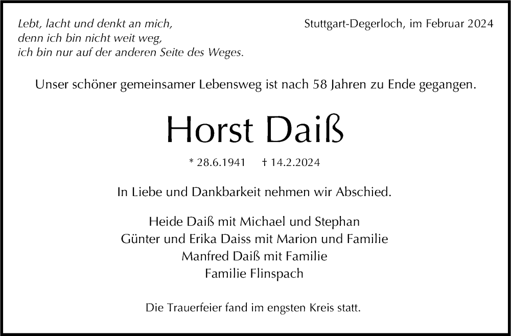 Hier finden Sie alle Traueranzeigen aus der Zeitung, die bisher für Horst Daiß erschienen sind. Weitere Traueranzeigen, die in der Zeitung erscheinen, werden hier ebenfalls aufgelistet