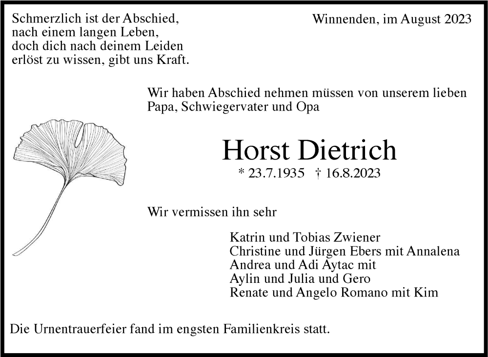 Hier finden Sie alle Traueranzeigen aus der Zeitung, die bisher für Horst Dietrich erschienen sind. Weitere Traueranzeigen, die in der Zeitung erscheinen, werden hier ebenfalls aufgelistet