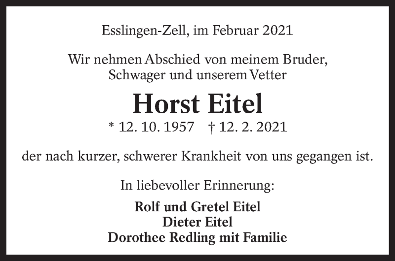 Hier finden Sie alle Traueranzeigen aus der Zeitung, die bisher für Horst Eitel erschienen sind. Weitere Traueranzeigen, die in der Zeitung erscheinen, werden hier ebenfalls aufgelistet