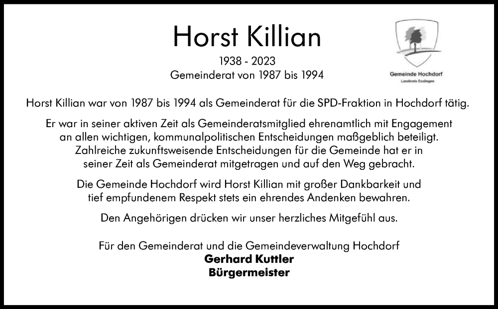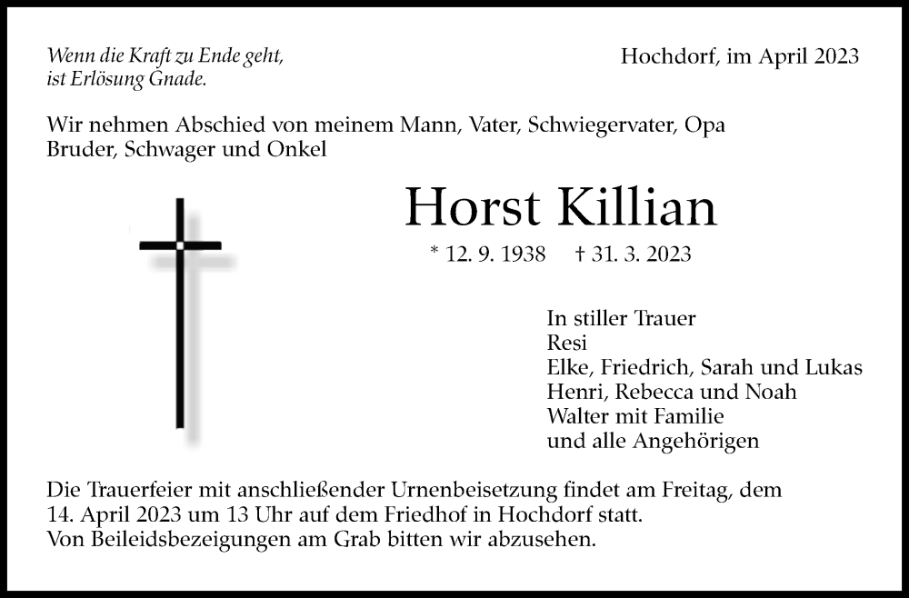 Hier finden Sie alle Traueranzeigen aus der Zeitung, die bisher für Horst Killian erschienen sind. Weitere Traueranzeigen, die in der Zeitung erscheinen, werden hier ebenfalls aufgelistet