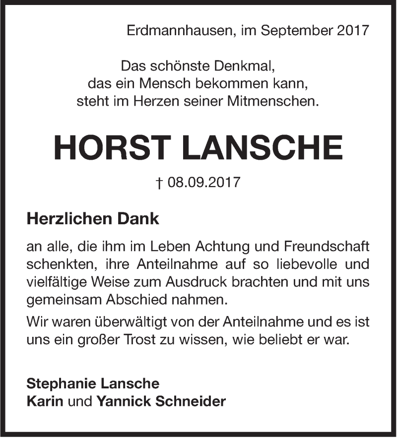 Hier finden Sie alle Traueranzeigen aus der Zeitung, die bisher für Horst Lansche erschienen sind. Weitere Traueranzeigen, die in der Zeitung erscheinen, werden hier ebenfalls aufgelistet