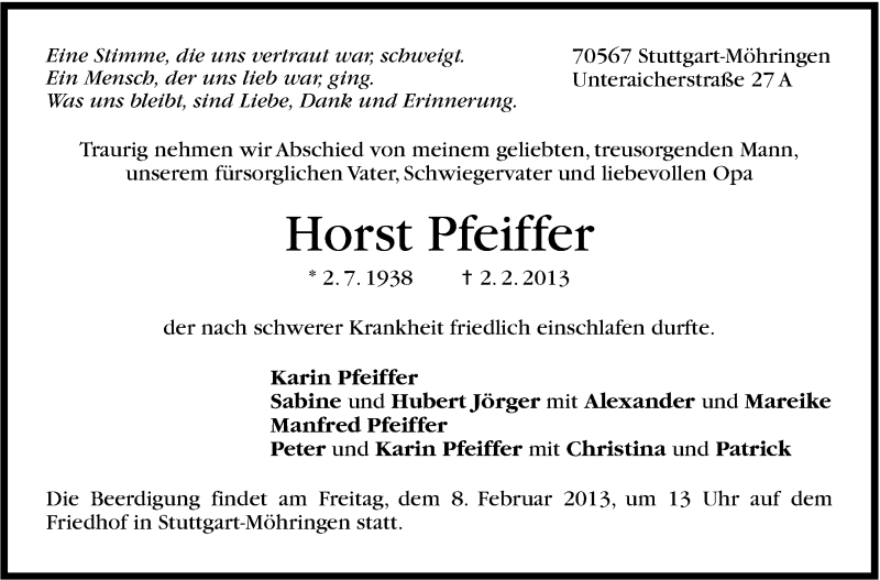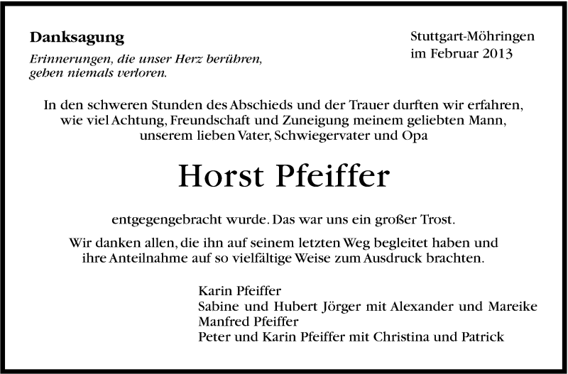 Hier finden Sie alle Traueranzeigen aus der Zeitung, die bisher für Horst Pfeiffer erschienen sind. Weitere Traueranzeigen, die in der Zeitung erscheinen, werden hier ebenfalls aufgelistet