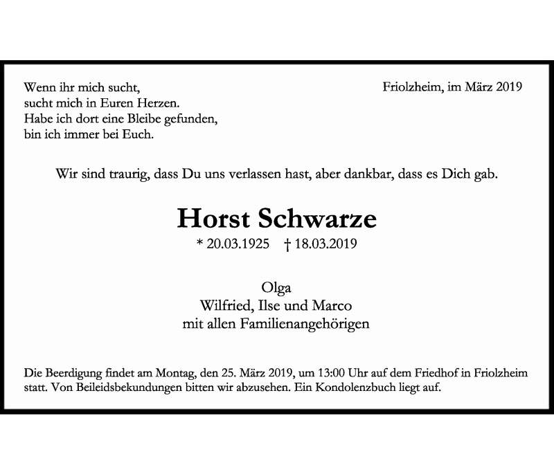 Hier finden Sie alle Traueranzeigen aus der Zeitung, die bisher für Horst Schwarze erschienen sind. Weitere Traueranzeigen, die in der Zeitung erscheinen, werden hier ebenfalls aufgelistet