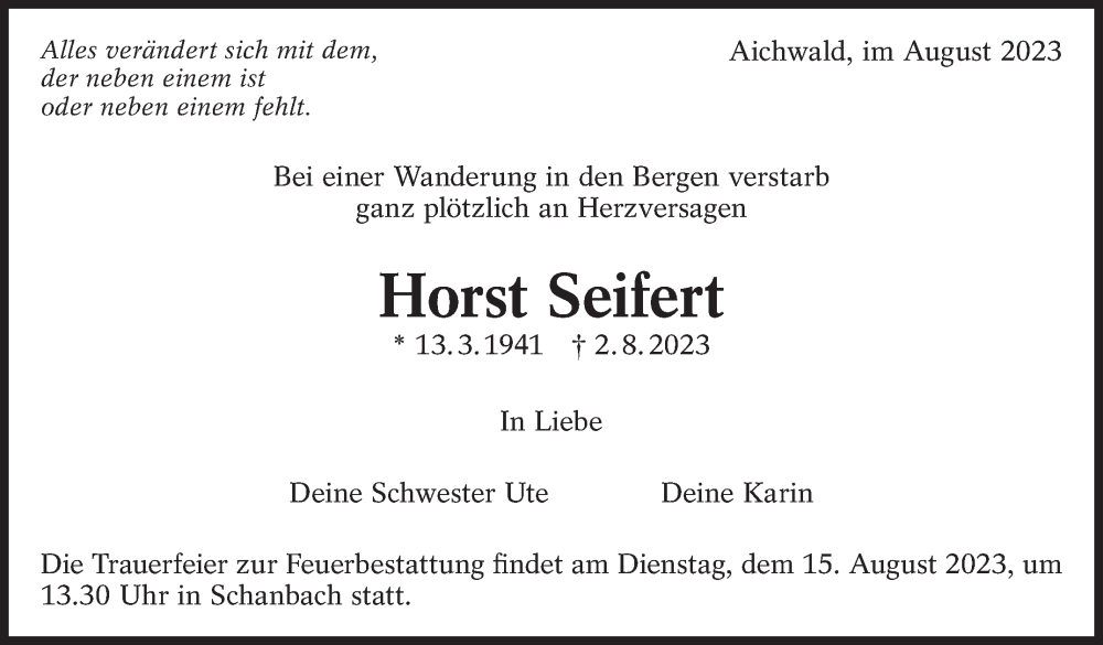 Hier finden Sie alle Traueranzeigen aus der Zeitung, die bisher für Horst Seifert erschienen sind. Weitere Traueranzeigen, die in der Zeitung erscheinen, werden hier ebenfalls aufgelistet
