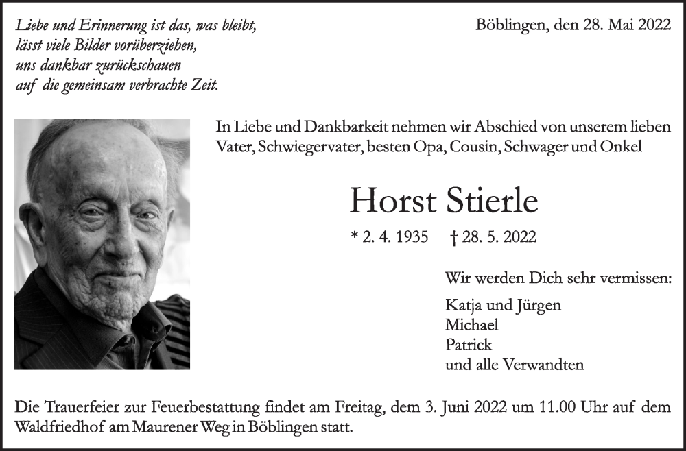 Hier finden Sie alle Traueranzeigen aus der Zeitung, die bisher für Horst Stierle erschienen sind. Weitere Traueranzeigen, die in der Zeitung erscheinen, werden hier ebenfalls aufgelistet
