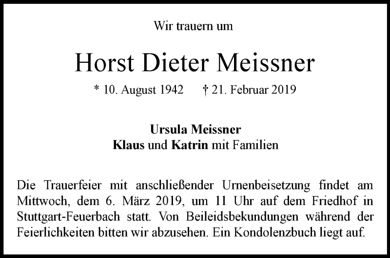 Hier finden Sie alle Traueranzeigen aus der Zeitung, die bisher für Horst Dieter Meissner erschienen sind. Weitere Traueranzeigen, die in der Zeitung erscheinen, werden hier ebenfalls aufgelistet