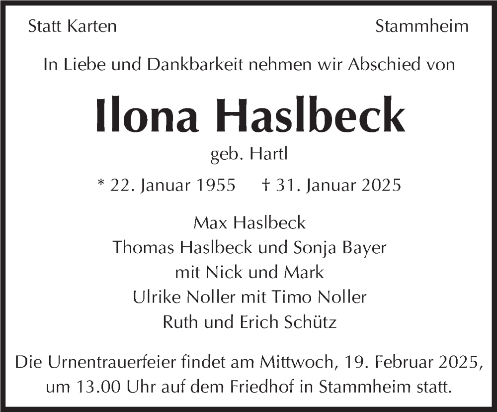 Hier finden Sie alle Traueranzeigen aus der Zeitung, die bisher für Ilona Haslbeck erschienen sind. Weitere Traueranzeigen, die in der Zeitung erscheinen, werden hier ebenfalls aufgelistet