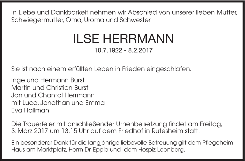 Hier finden Sie alle Traueranzeigen aus der Zeitung, die bisher für Ilse Herrmann erschienen sind. Weitere Traueranzeigen, die in der Zeitung erscheinen, werden hier ebenfalls aufgelistet