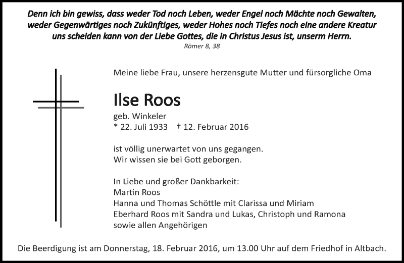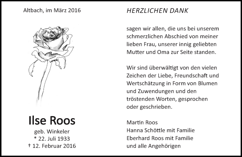 Hier finden Sie alle Traueranzeigen aus der Zeitung, die bisher für Ilse Roos erschienen sind. Weitere Traueranzeigen, die in der Zeitung erscheinen, werden hier ebenfalls aufgelistet