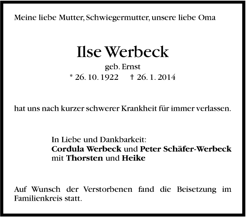 Hier finden Sie alle Traueranzeigen aus der Zeitung, die bisher für Ilse Werbeck erschienen sind. Weitere Traueranzeigen, die in der Zeitung erscheinen, werden hier ebenfalls aufgelistet