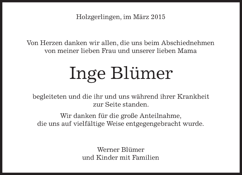 Hier finden Sie alle Traueranzeigen aus der Zeitung, die bisher für Inge Blümer erschienen sind. Weitere Traueranzeigen, die in der Zeitung erscheinen, werden hier ebenfalls aufgelistet