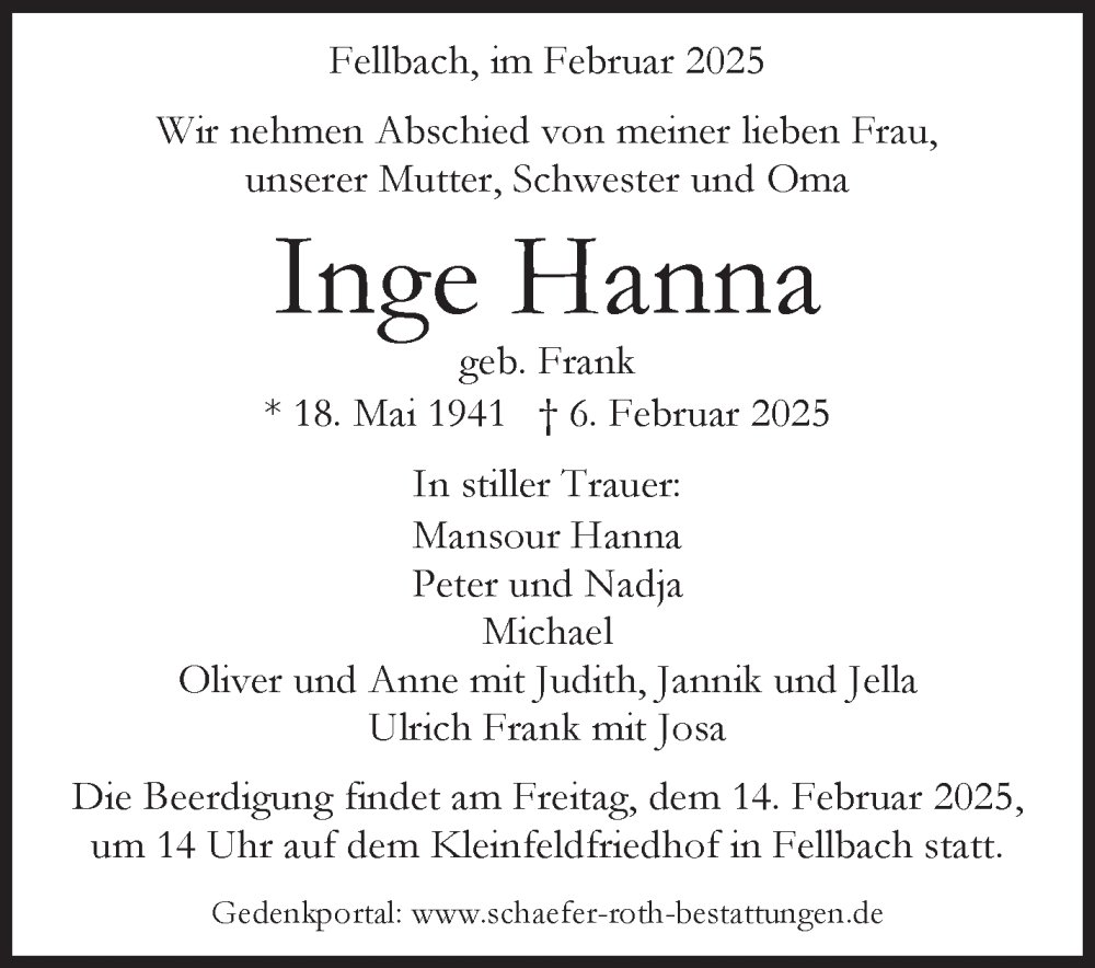 Hier finden Sie alle Traueranzeigen aus der Zeitung, die bisher für Inge Hanna erschienen sind. Weitere Traueranzeigen, die in der Zeitung erscheinen, werden hier ebenfalls aufgelistet