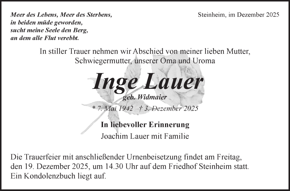 Hier finden Sie alle Traueranzeigen aus der Zeitung, die bisher für Inge Lauer erschienen sind. Weitere Traueranzeigen, die in der Zeitung erscheinen, werden hier ebenfalls aufgelistet