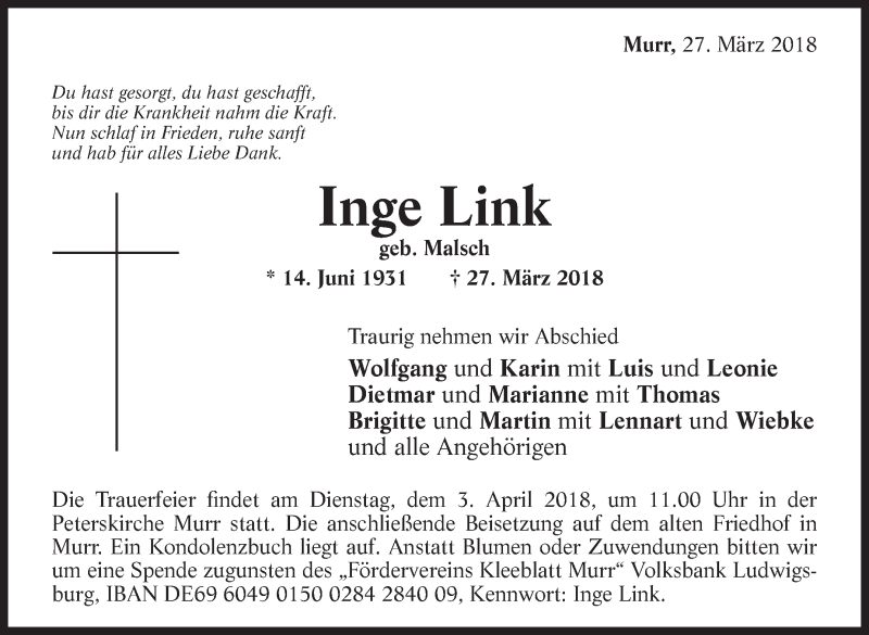 Hier finden Sie alle Traueranzeigen aus der Zeitung, die bisher für Inge Link erschienen sind. Weitere Traueranzeigen, die in der Zeitung erscheinen, werden hier ebenfalls aufgelistet