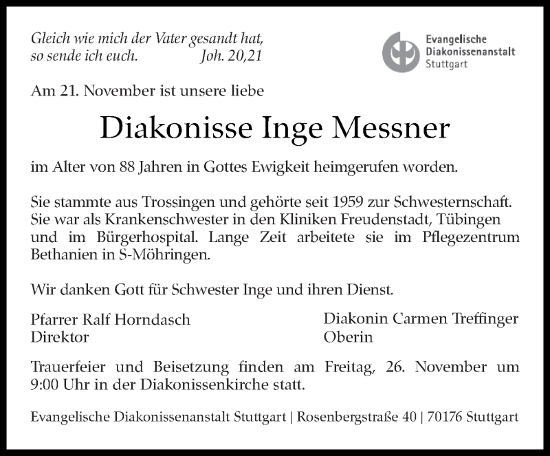Hier finden Sie alle Traueranzeigen aus der Zeitung, die bisher für Inge Messner erschienen sind. Weitere Traueranzeigen, die in der Zeitung erscheinen, werden hier ebenfalls aufgelistet