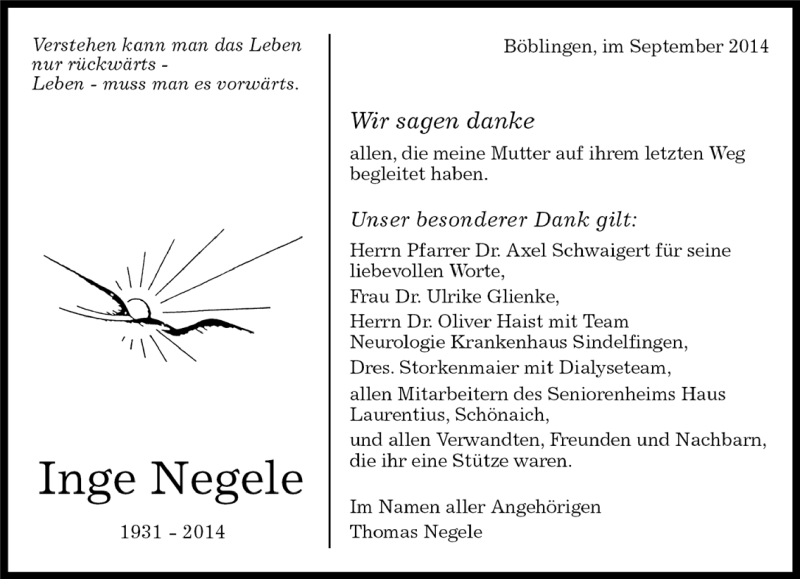 Hier finden Sie alle Traueranzeigen aus der Zeitung, die bisher für Inge Negele erschienen sind. Weitere Traueranzeigen, die in der Zeitung erscheinen, werden hier ebenfalls aufgelistet