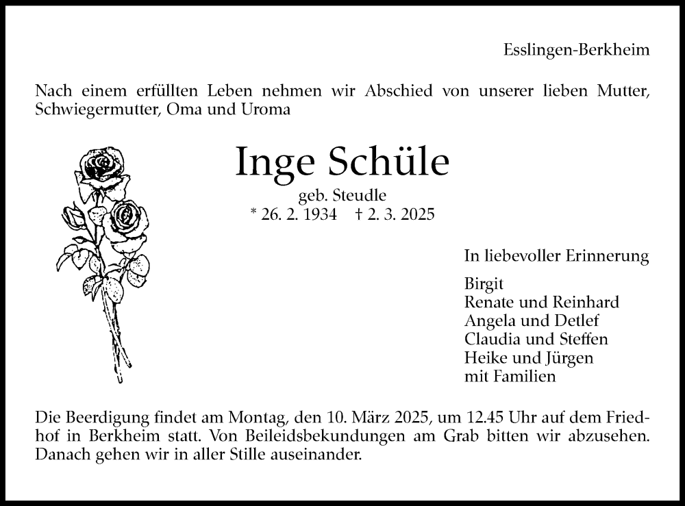 Hier finden Sie alle Traueranzeigen aus der Zeitung, die bisher für Inge Schüle erschienen sind. Weitere Traueranzeigen, die in der Zeitung erscheinen, werden hier ebenfalls aufgelistet