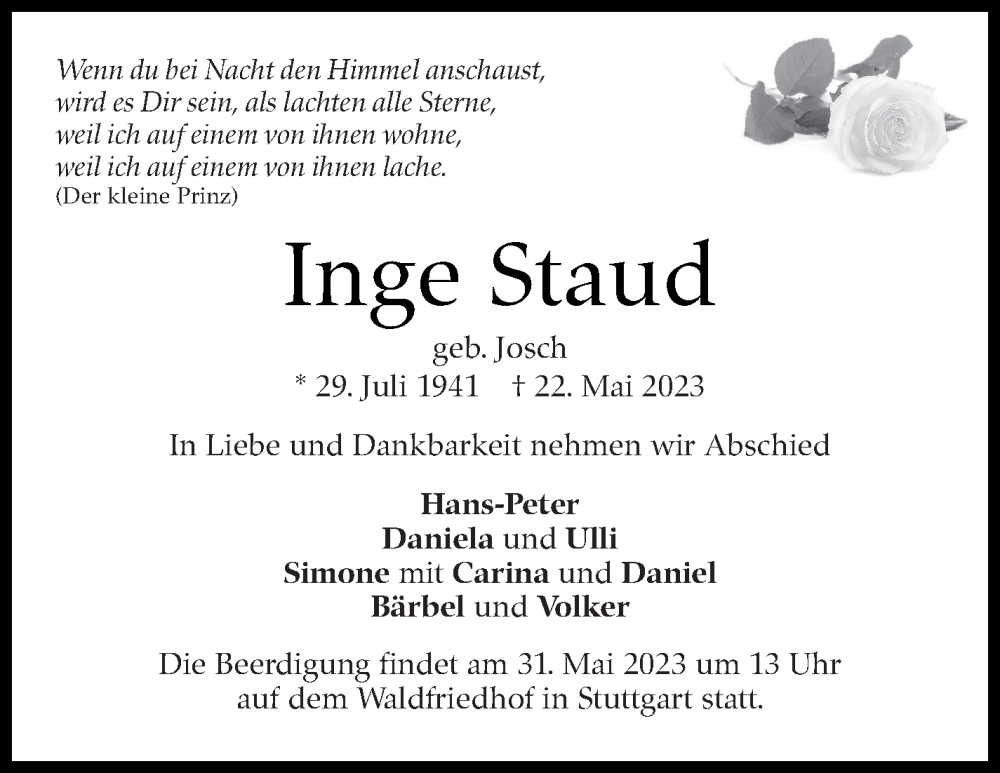 Hier finden Sie alle Traueranzeigen aus der Zeitung, die bisher für Inge Staud erschienen sind. Weitere Traueranzeigen, die in der Zeitung erscheinen, werden hier ebenfalls aufgelistet