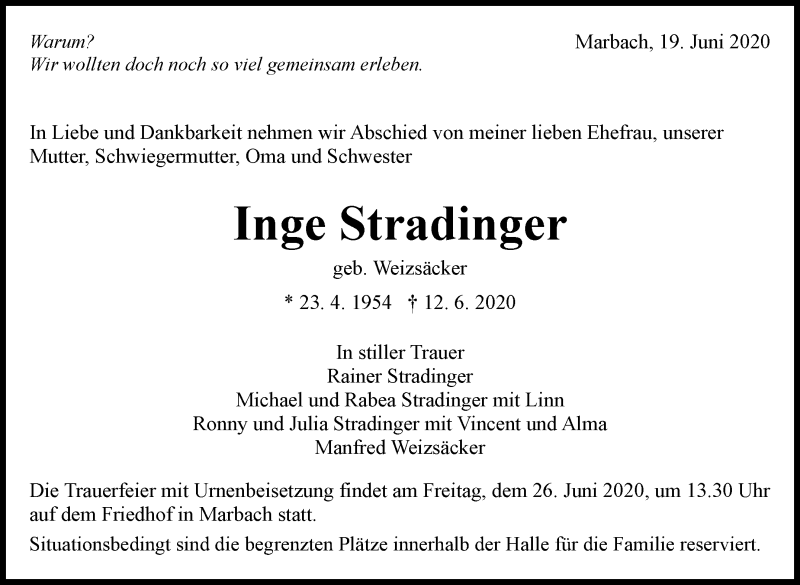 Hier finden Sie alle Traueranzeigen aus der Zeitung, die bisher für Inge Stradinger erschienen sind. Weitere Traueranzeigen, die in der Zeitung erscheinen, werden hier ebenfalls aufgelistet