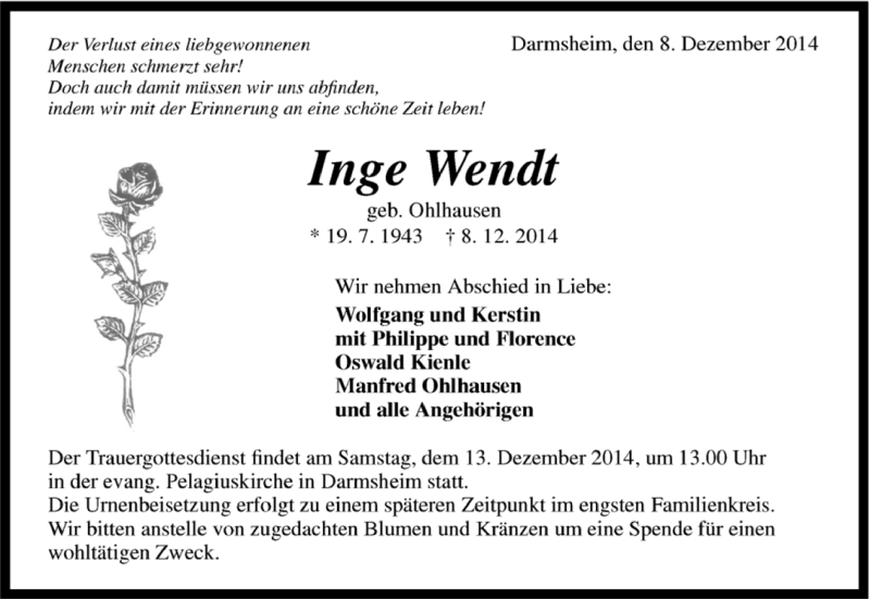 Hier finden Sie alle Traueranzeigen aus der Zeitung, die bisher für Inge Wendt erschienen sind. Weitere Traueranzeigen, die in der Zeitung erscheinen, werden hier ebenfalls aufgelistet
