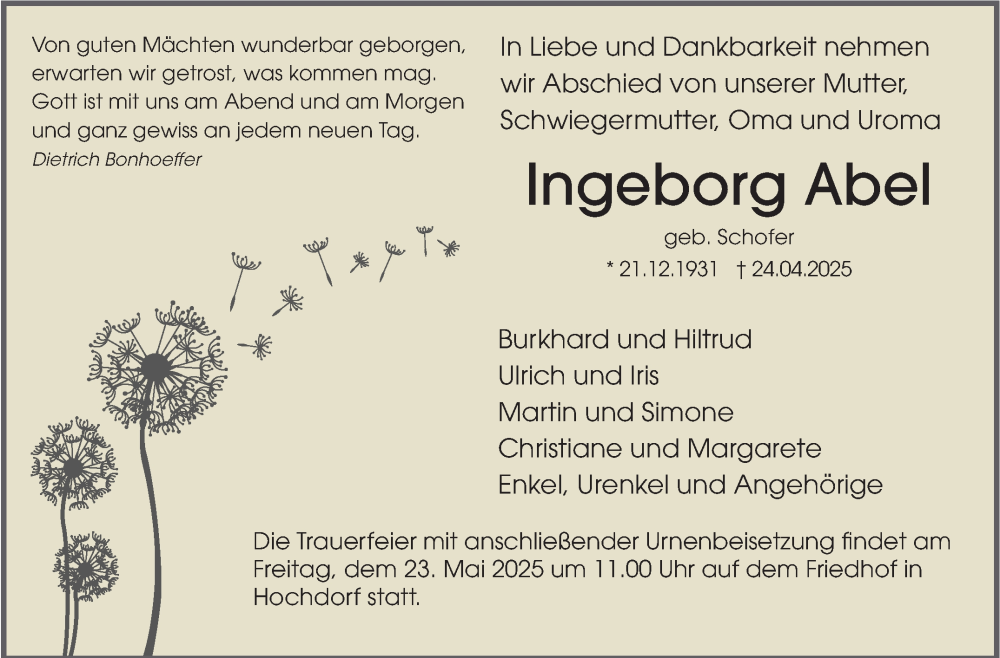 Hier finden Sie alle Traueranzeigen aus der Zeitung, die bisher für Ingeborg Abel erschienen sind. Weitere Traueranzeigen, die in der Zeitung erscheinen, werden hier ebenfalls aufgelistet