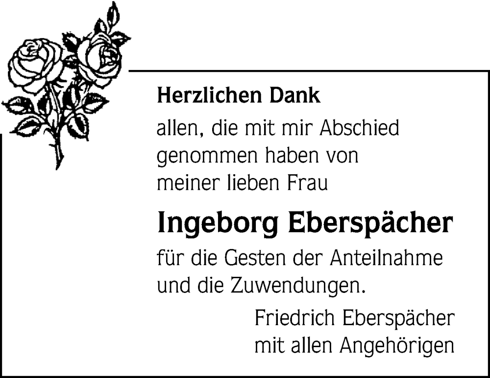 Hier finden Sie alle Traueranzeigen aus der Zeitung, die bisher für Ingeborg Eberspächer erschienen sind. Weitere Traueranzeigen, die in der Zeitung erscheinen, werden hier ebenfalls aufgelistet