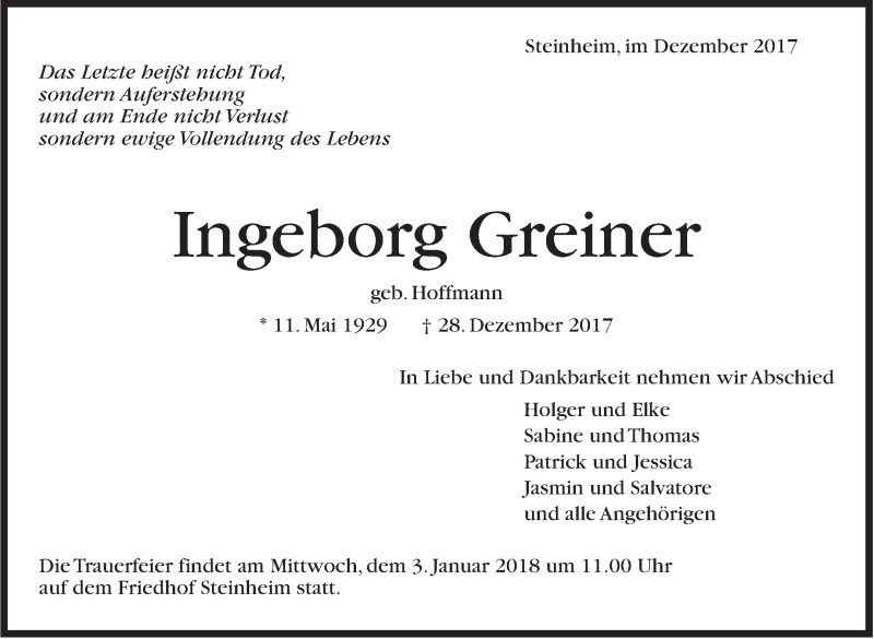 Hier finden Sie alle Traueranzeigen aus der Zeitung, die bisher für Ingeborg Greiner erschienen sind. Weitere Traueranzeigen, die in der Zeitung erscheinen, werden hier ebenfalls aufgelistet