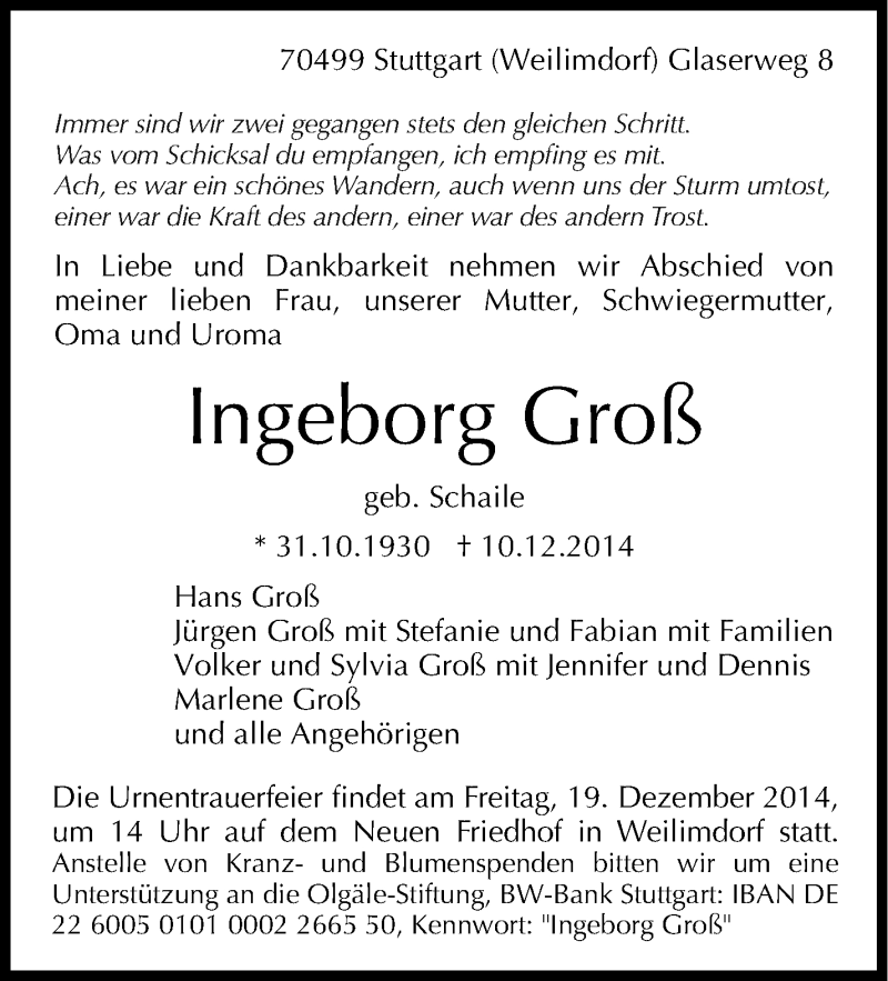 Hier finden Sie alle Traueranzeigen aus der Zeitung, die bisher für Ingeborg Groß erschienen sind. Weitere Traueranzeigen, die in der Zeitung erscheinen, werden hier ebenfalls aufgelistet
