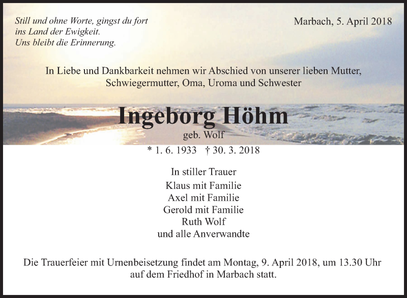 Hier finden Sie alle Traueranzeigen aus der Zeitung, die bisher für Ingeborg Hoehm erschienen sind. Weitere Traueranzeigen, die in der Zeitung erscheinen, werden hier ebenfalls aufgelistet