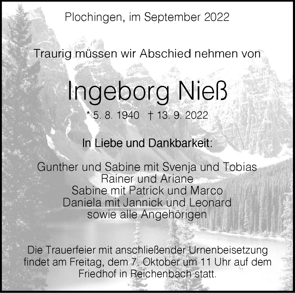 Hier finden Sie alle Traueranzeigen aus der Zeitung, die bisher für Ingeborg Nieß erschienen sind. Weitere Traueranzeigen, die in der Zeitung erscheinen, werden hier ebenfalls aufgelistet